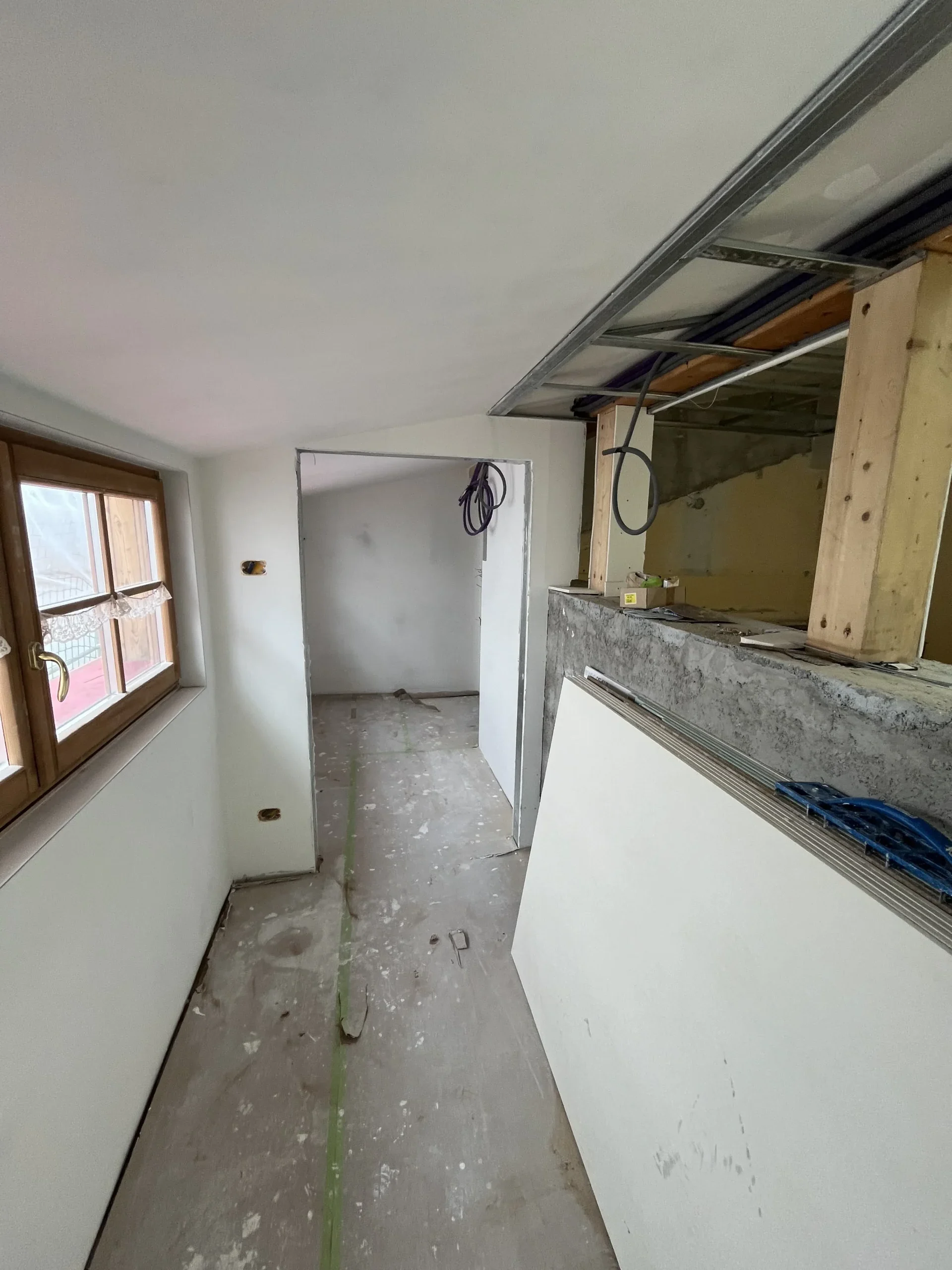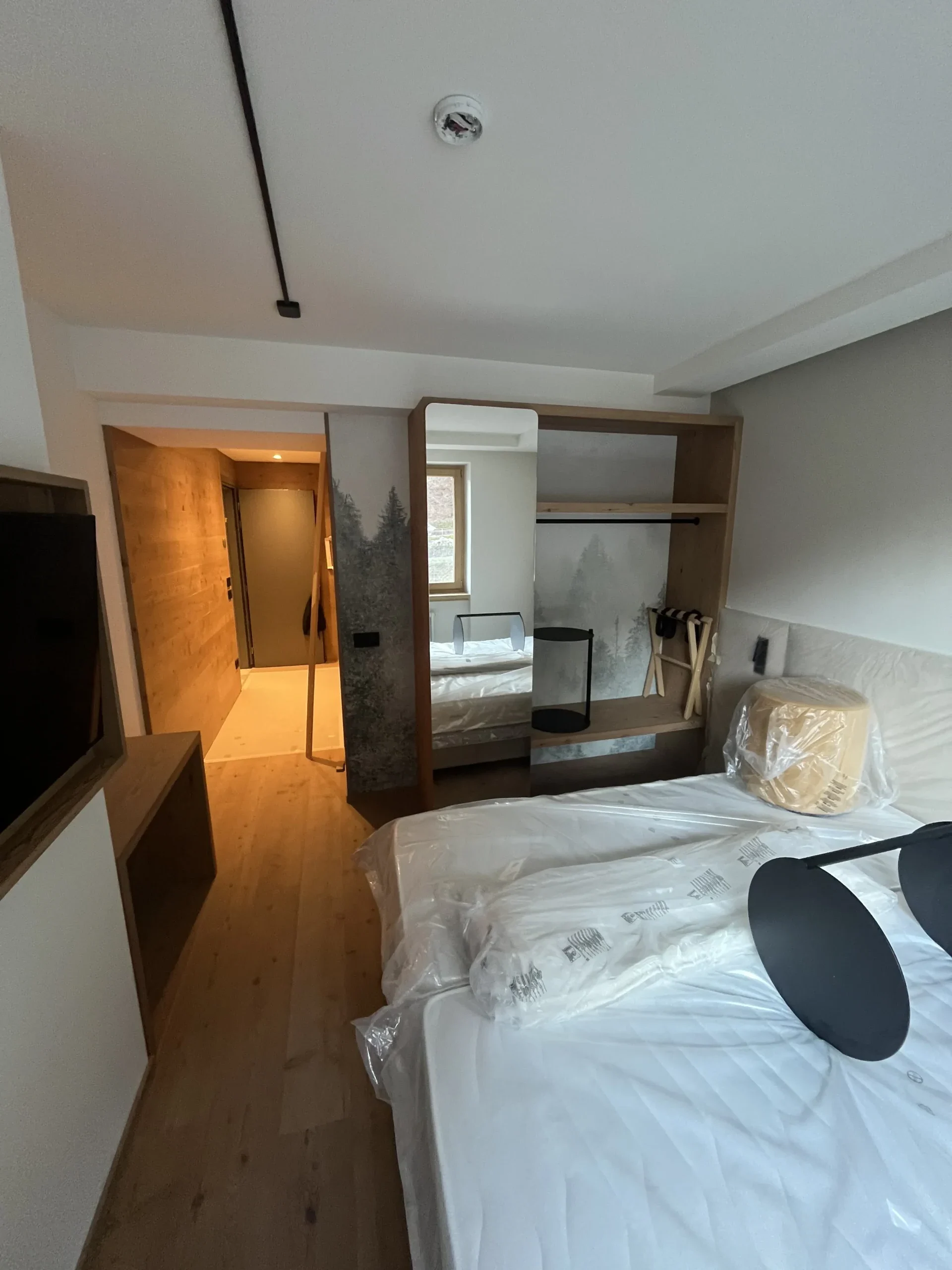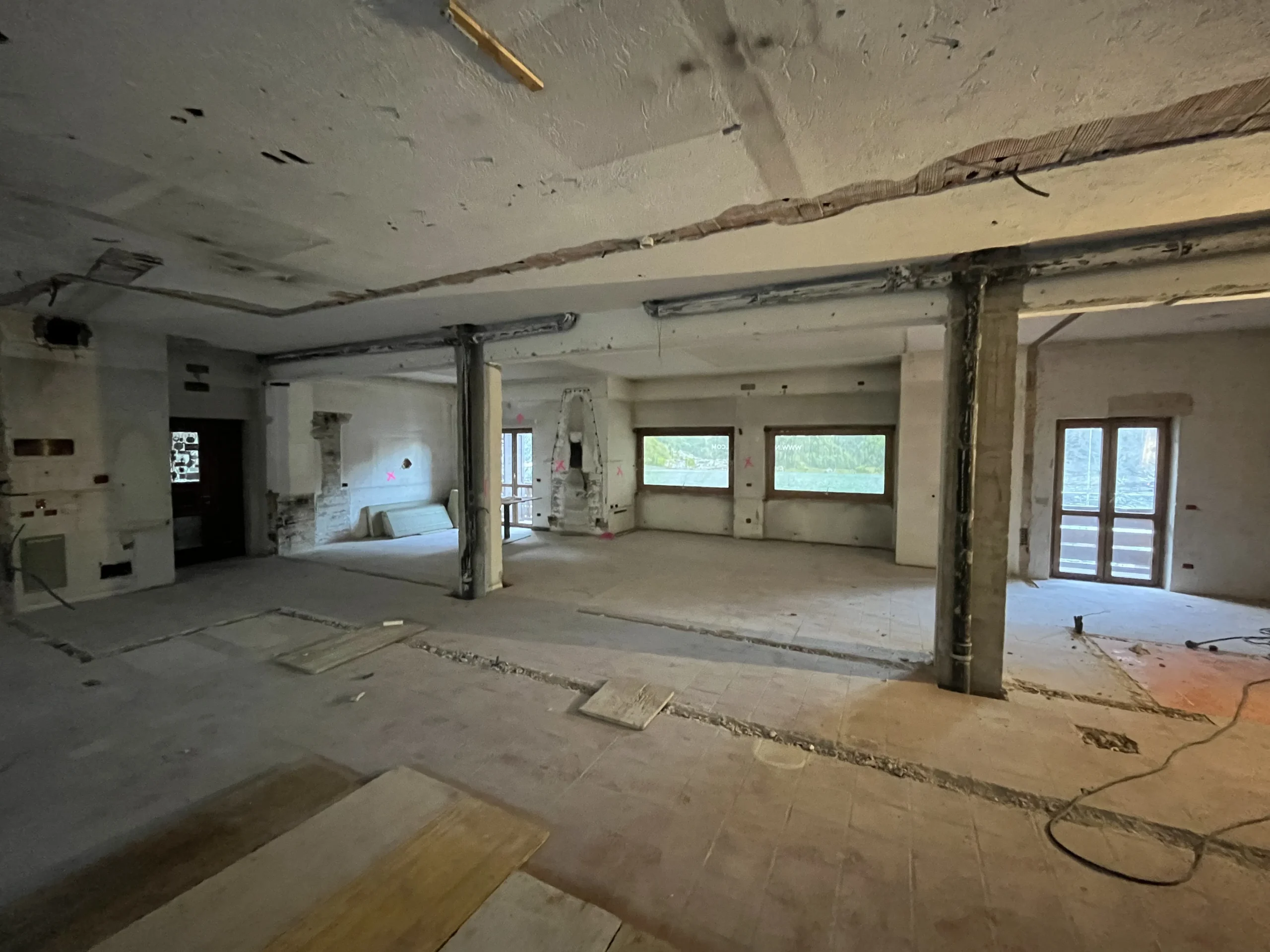 Ristrutturazione ex Hotel Alleghe con demolizione interna e nuovi divisori e rivestimenti in cartongesso. Per la natura della struttura è stato effettuato anche un massiccio intervento di protezione dal fuoco ed un accurato isolamento termico ed acustico dei locali.
